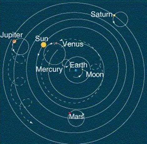 Sơ đồ thuyết địa tâm, trong đó trái đất nằm ở vị trí trung tâm, còn các hành tinh khác bao gồm cả mặt trời đều quay nó theo quỹ đạo hình tròn. Ảnh: Discovery.
