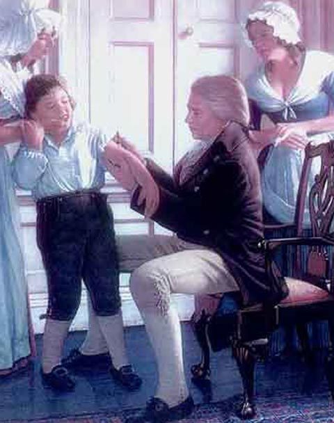 | Bác sĩ Edward Jenner tiêm liều vắc-xin đậu mùa đầu tiên cho cậu bé James Phipps vào ngày 14/5/1796. |