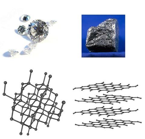| Mặc dù kim cương (trên, bên trái) và than chì (trên, bên phải) giống nhau về thành phần hóa học (cấu tạo hoàn toàn từ carbon) nhưng tinh thể học tia X cho thấy sự sắp xếp các nguyên tử khác nhau dẫn đến sự khác nhau về tính chất giữa chúng. |