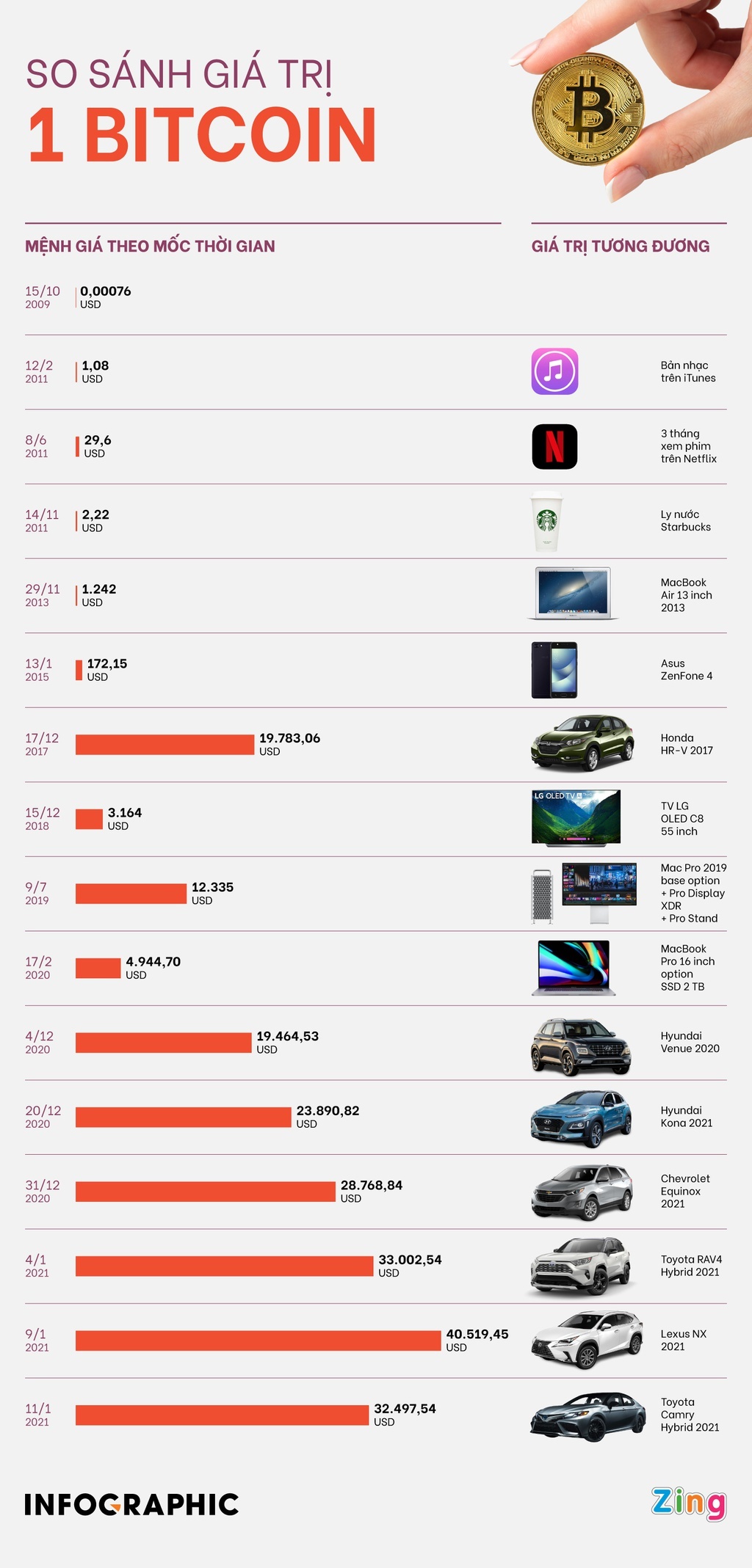 Từ xuất phát điểm vô giá trị, giờ đây 1 Bitcoin có thể mua được MacBook, xe hơi cao cấp.