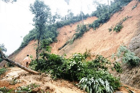 Lở núi gây đứt tuyến đường dây 35Kv và nhánh rẽ 22 Kv khiến huyện Nam Trà My và Phước Sơn mất điện.