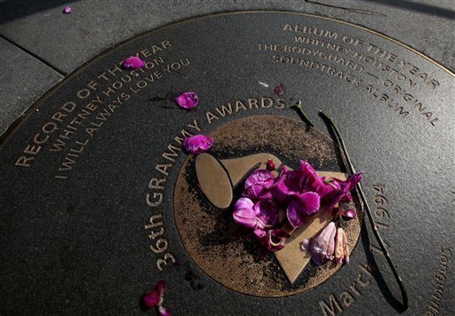 Người hâm mộ đặt hoa tưởng nhớ Whitney Houston ở bất cứ đâu gợi nhớ cô. Ảnh: AP |