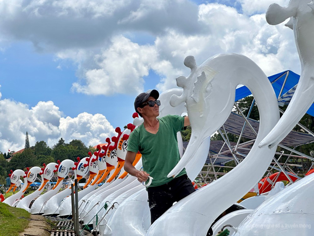 Hồ Xuân Hương như một nơi phải ghé thăm của khách du lịch. Cảm giác ngồi trên chiếc thuyền thiên nga, đạp ra giữa hồ dù khá cổ điển, cũ kỹ nhưng rất bình yên giữa mênh mông nước. Tấm ảnh chụp trong điều kiện ngược sáng, nắng hơi gắt nhưng gương mặt người thợ vẽ thiên nga vẫn được thể hiện rõ.