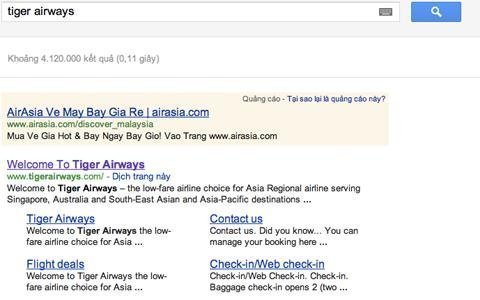 | Thử tìm với từ khoá Tiger Airways, kết quả dòng đầu tiên lại ra... hãng hàng không đối thủ. |