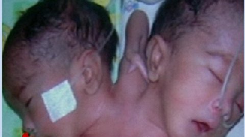 | Ngày 19/10/2010, một cặp song sinh dính liền đã được sinh ra tại bệnh viện Al-Shatbi (bang Alexandria, Ai Cập). Theo đó cặp song sinh này có 2 đầu riêng biệt, 3 chân nhưng chỉ có một ngực, một dây rốn và một bộ phận sinh dục. Đây là cặp song sinh dính liền có hai đầu thứ 10 trên toàn thế giới. (Ảnh: JPNews) |
