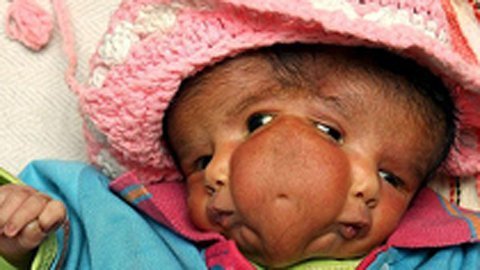Bé gái Lali chào đời ngày11/3/2008 tại một ngôi làng thuộc miền bắc Ấn Độ. Hình ảnh kỳ dị của bé lại được tôn thờ là sự hiện thân của một nữ thần Hindu. Cô bé có 2 mũi, 2 miệng, 2 lưỡi, 2 cặp mắt, trừ một đôi tai.(Ảnh: AP) |