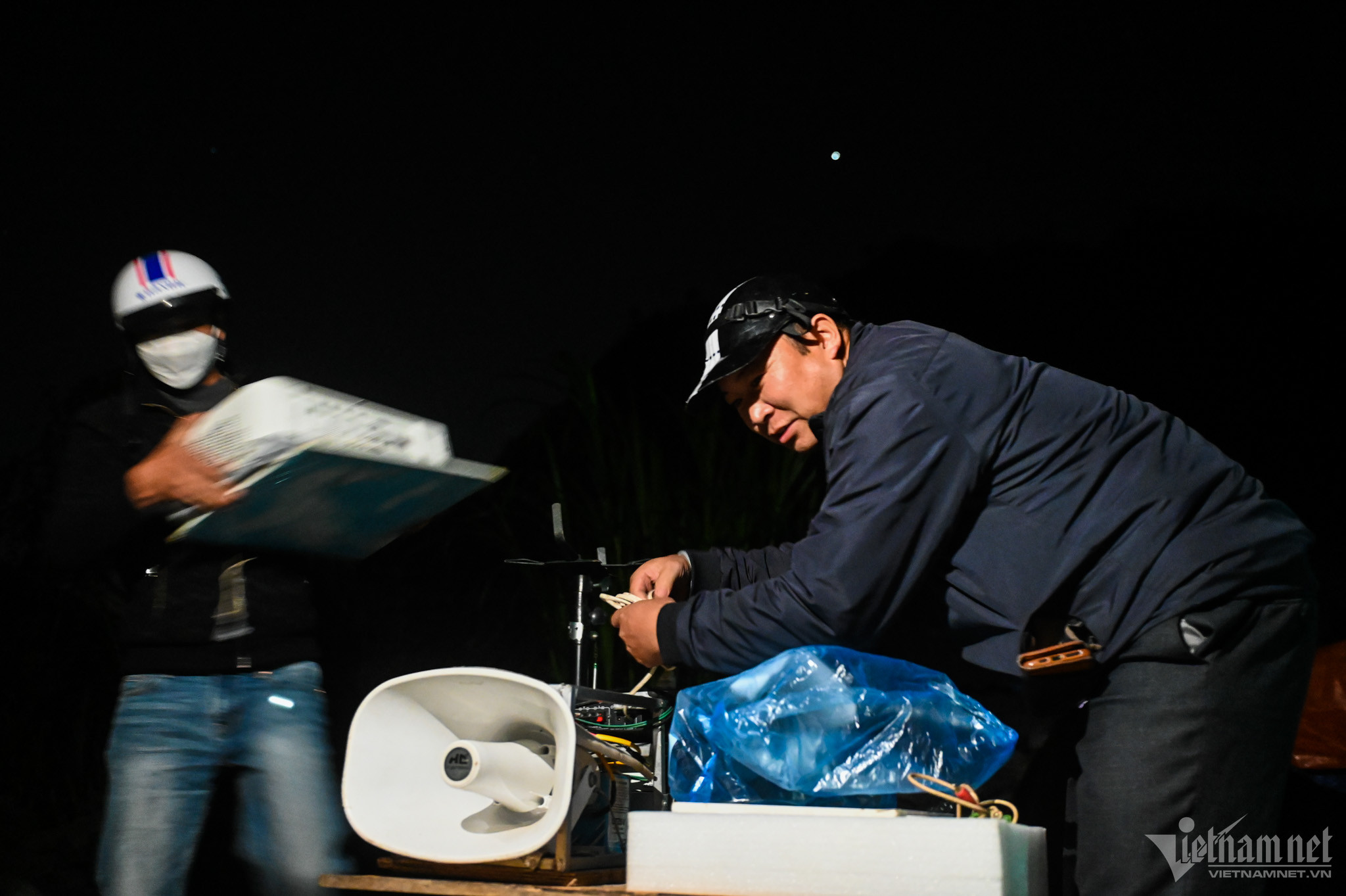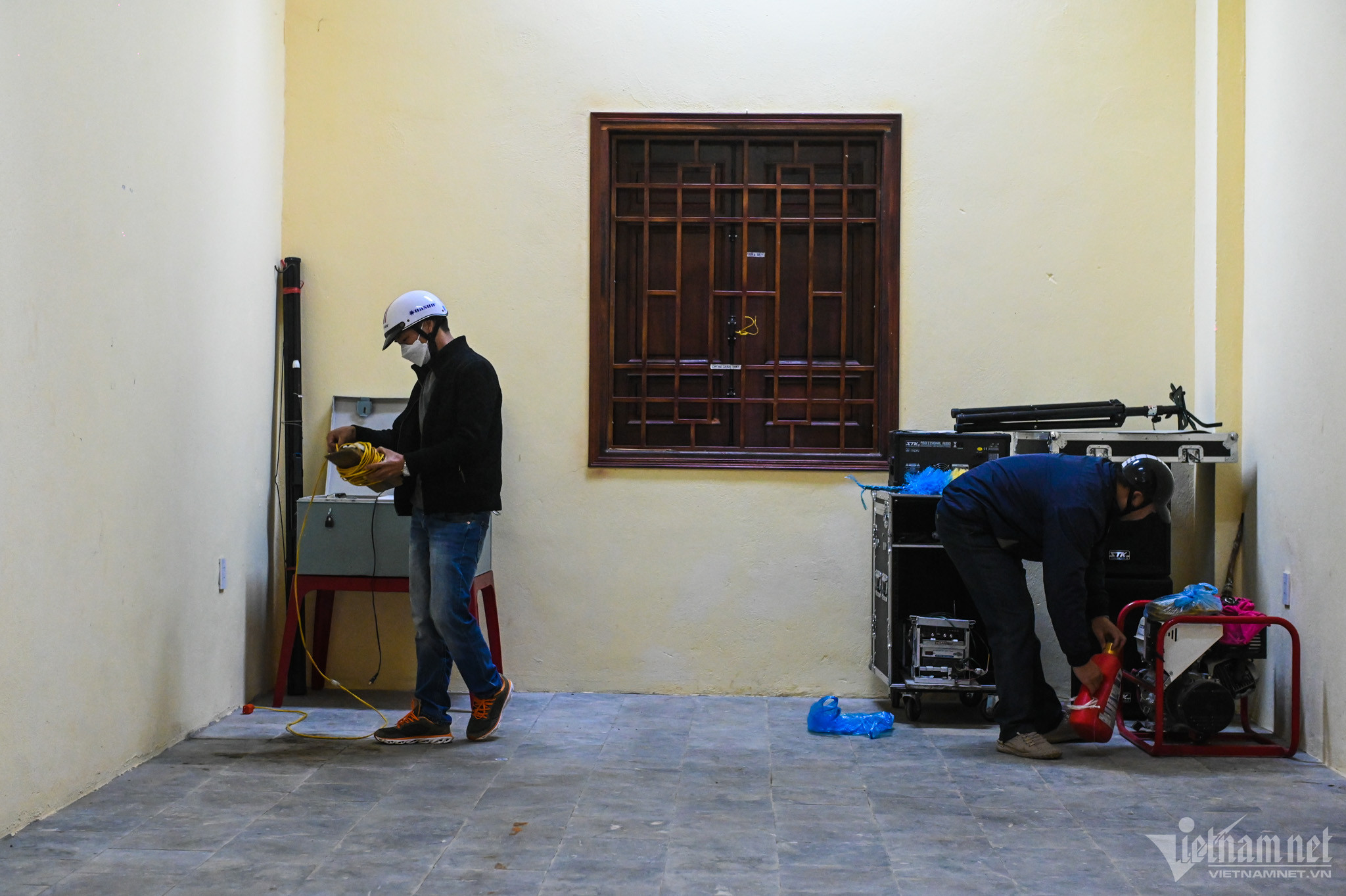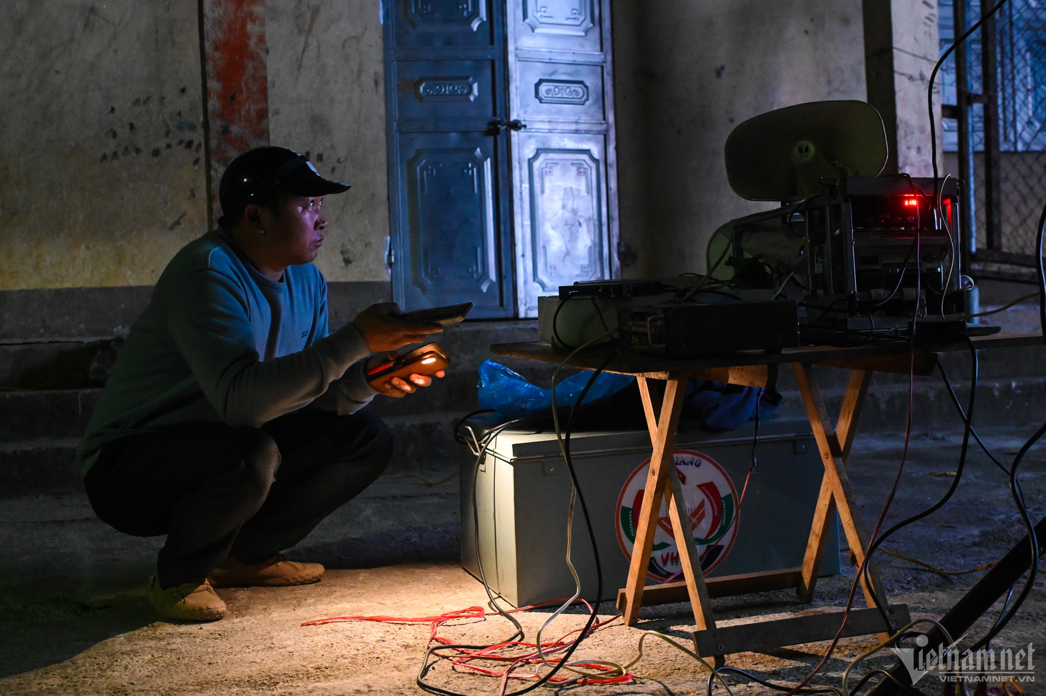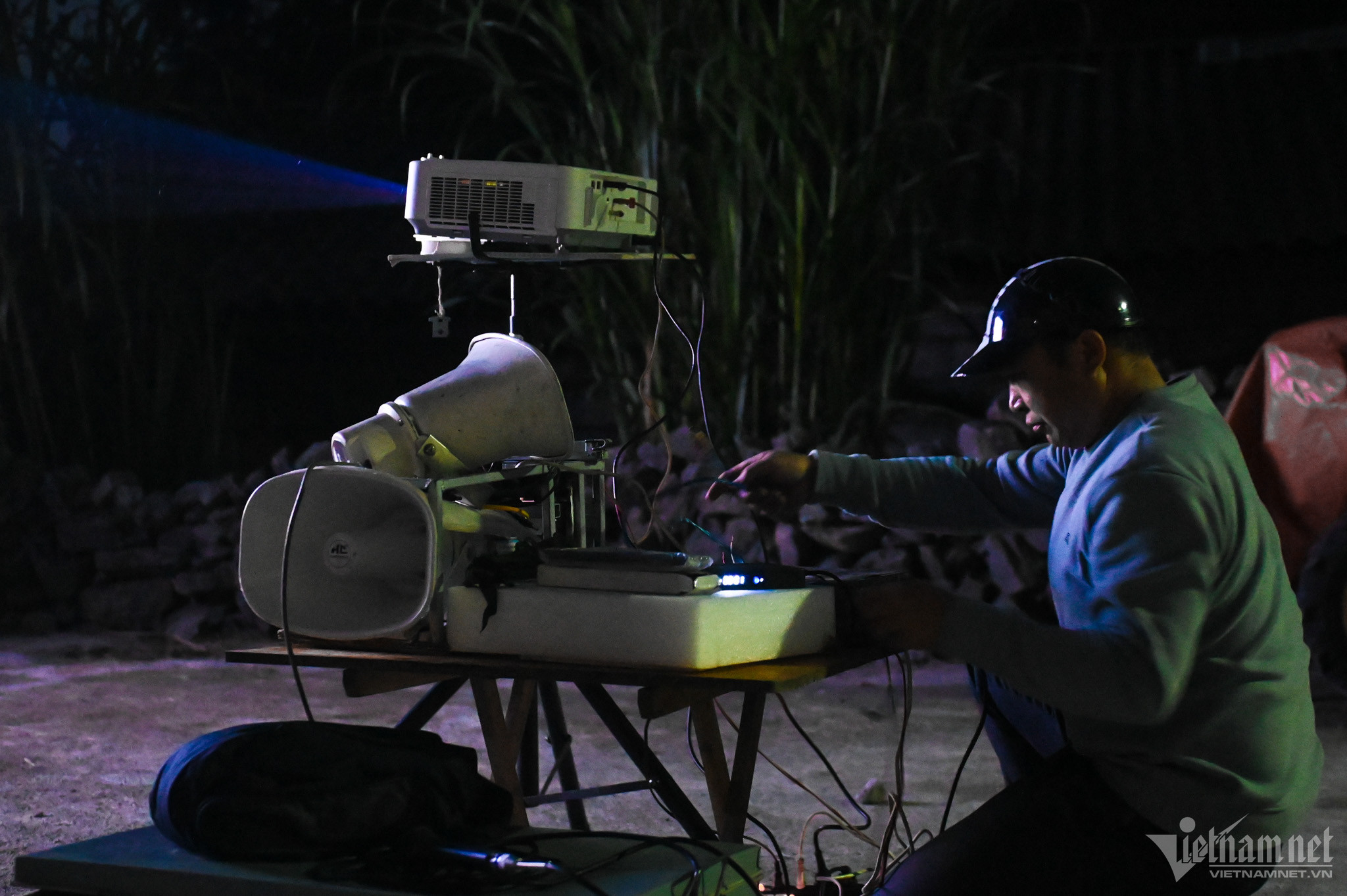 Tận dụng chút thời gian ít ỏi lúc chập choạng tối, anh Tuân, anh Quỳnh mỗi người một việc, lắp đặt máy chiếu, phát phát điện. Chiếc loa được đặt ngay ngắn trên thùng nhôm, kết nối với điện thoại đã lưu sẵn những thước phim.