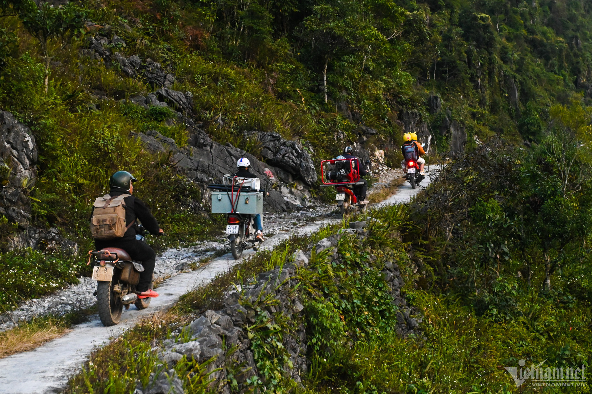 Chốc chốc đoàn phải dừng lại khi đi qua đoạn đá lở hay vật cản. Giữ chắc tay ga, chân đạp số, những cung đường xẻ núi chẳng còn lạ gì với đội chiếu bóng nhưng cả hai vẫn phải tập trung cao độ bởi đường nhỏ một bên là núi cao, một bên là vực thẳm.