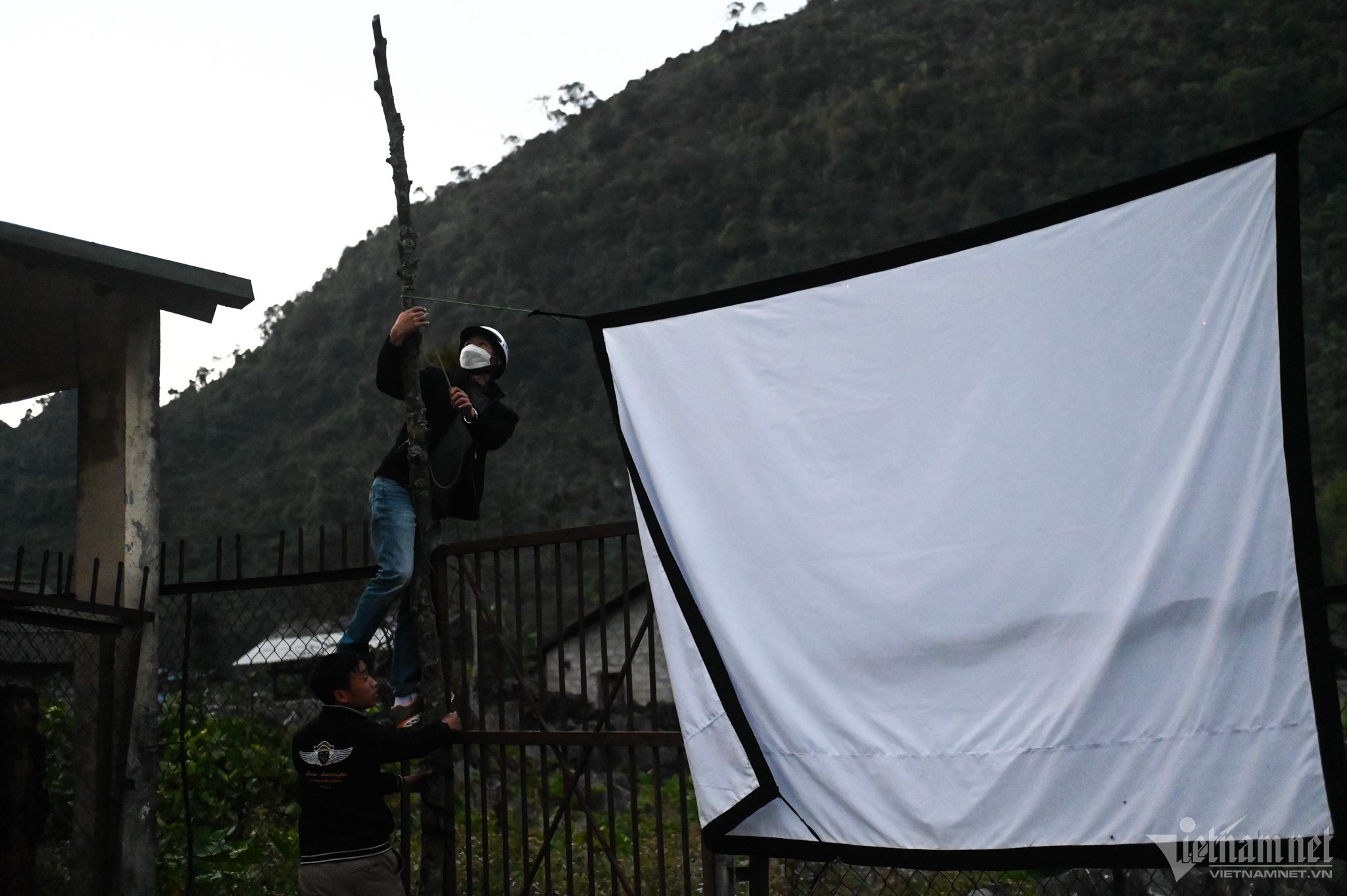 Anh Tuân dựng gọn xe máy, bê chiếc máy phát điện cồng kềnh xuống. Người tuyên truyền viên với dáng vóc to khỏe dường như đã quá thạo việc. Anh đi đến đống củi dựng cạnh một ngôi nhà đất, chọn lấy một thân gỗ đủ cao để căng màn chiếu.