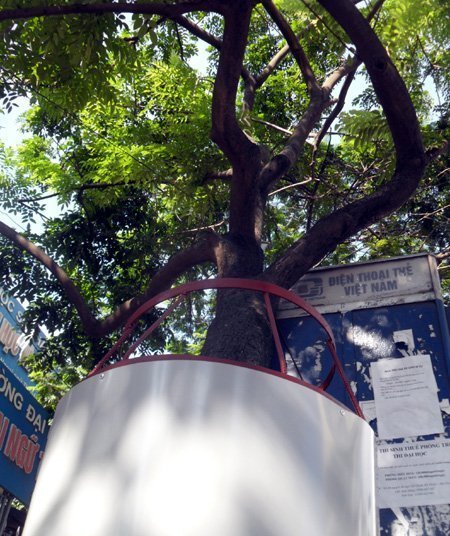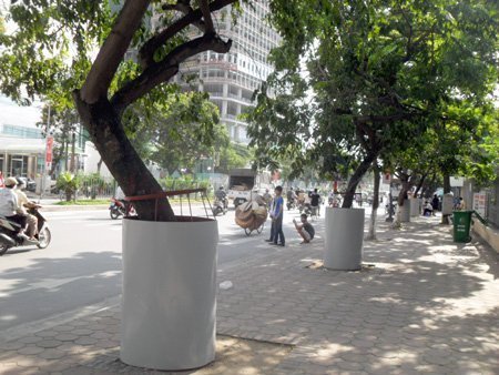 | "Mặc giáp sắt" cho hàng sưa trên đường Xuân Thủy, Cầu Giấy (HN) vào tháng 7/2011, nhưng ngay sau đó, giải pháp này được dỡ bỏ vì lý do gây mất mỹ quan đô thị. |