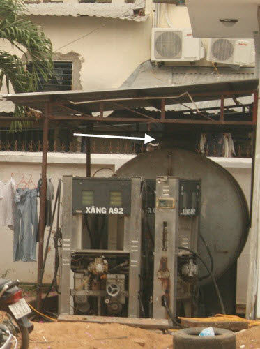 | Miệng bồn xăng nơi anh Sơn chui xuống (mũi tên) |