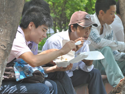 | Nhiều phụ huynh ở điểm thi ĐH Luật chọn cơm miễn phí để không mất thời gian đi lại ở các quán ăn. Ảnh: Nguyễn Hường |