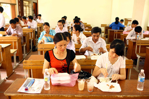 Từ 10h sáng, 2000 suất cơm công nghiệp đã được chở đến sân ký túc xá của trường cùng với hàng nghìn chai nước lọc. Hai phòng hội trường tầng 2 đã được sinh viên quét dọn sạch sẽ, bật quạt để làm mát không gian, sẵn sàng dành chỗ để các thí sinh lên ăn cơm. Suất cơm đơn giản chỉ có rau, thịt và một ít lạc cùng với nước canh rau muốn nhưng có lẽ qua 3 giờ thi, sỹ tử đã đói nên ăn rất ngon lành.