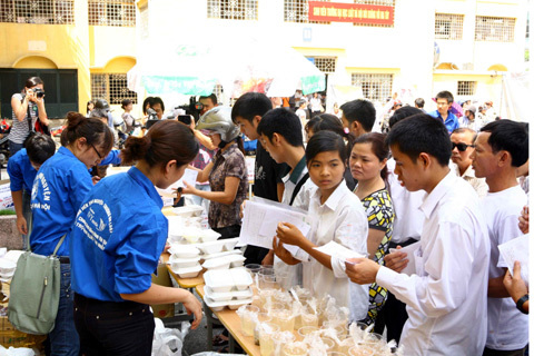 phát các xuất cơm miễn phí cho người nhà và sĩ tử. (Ảnh Văn Chung) |