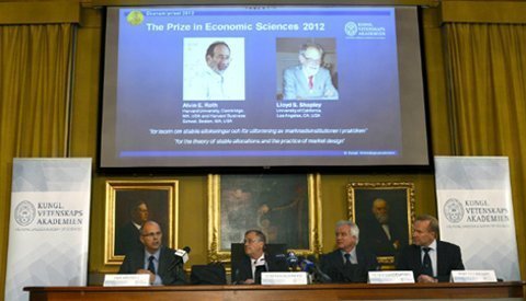Giải Nobel kinh tế năm nay được Viện Hàn lâm Khoa học Hoàng gia Thuỵ Điển trao cho hai nhà kinh tế người Mỹ là Alvin E. Roth (61 tuổi) của Đại học Harvard và Lloyd Shapley (89 tuổi) của UCLA cho nghiên cứu của họ trong việc gắn kết các dữ kiện kinh tế và các nhân tố trong nền kinh tế như sinh viên và trường học, người nhận nội tạng và người hiến nội tạng… một cách hiệu quả nhất.