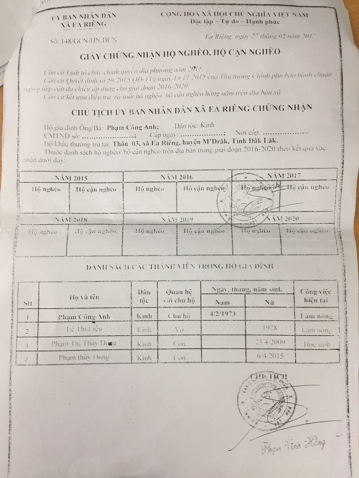 Gia đình anh Phạm Công Anh và chị Lê Thị Liễn thuộc diện hộ nghèo của địa phương. Họ được địa phương hỗ trợ thoát nghèo bằng cách, cho vay 30 triệu đồng để chăn nuôi, trồng trọt. Hai vợ chồng anh mua một con bò và đầu tư trồng, chăm bón mấy sào cà phê. Gia đình chưa thoát được nghèo, cô con gái đã mắc bệnh khiến khó khăn chồng chất khó khăn.