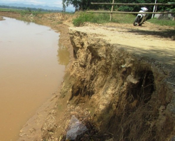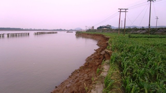 Tính khoảng 10 năm trở lại đây, nước sông đã “ăn” vào bờ chừng 50m. Năm 2007, ngành đường sắt “hốt hoảng” cho đóng một hàng cọc bê tông tổng chiều dài chừng 2km để “gia cố” cho diện tích vùng đầu bờ. Thế nhưng nay sau 4 năm, hàng cọc trước đây vốn được dựng trên diện tích đất sản xuất của bà con, đã nằm chơ vơ giữa lòng sông.