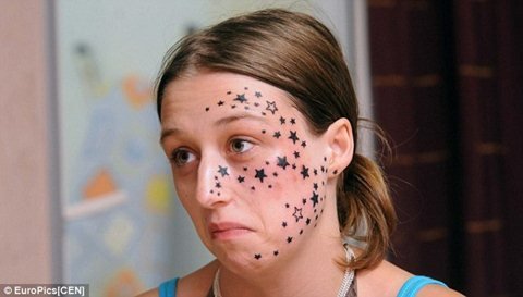 Một sai lầm tai hại đã khiến Kimberley Vlaeminck không dám ra khỏi nhà sau khi cô gái trẻ người Bỉ này quyết định xăm 56 ngôi sao lên mặt.