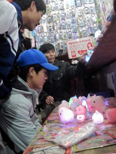 Lặng lẽ hơn và có phần trắc trở hơn là góc của những sinh viên mưu sinh tại chợ đêm những ngày Tết. Những “chủ hiệu” sinh viên thường có gương trẻ măng, vừa bán hàng vừa bẽn lẽn hoặc lôi kéo đông bạn bè đến ủng hộ.