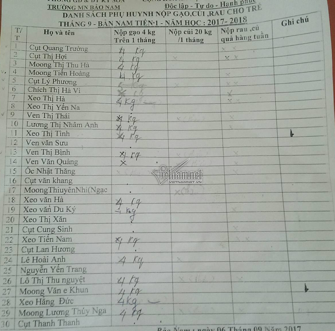 Trưởng phòng GD-ĐT huyện Kỳ Sơn, ông Nguyễn Hồng Hoa, xác nhận hầu hết các trường mầm non trên toàn huyện đều có phụ huynh đóng góp gạo, rau sạch.
