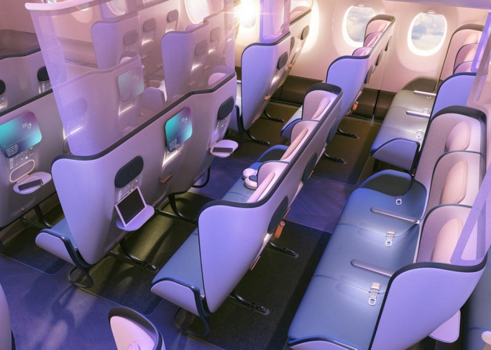 Thiết kế nội thất máy bay của công ty Priestman Goode với ghế được tối giản hóa, màn chắn ghế, sử dụng ánh sáng cực tím xa để khử khuẩn