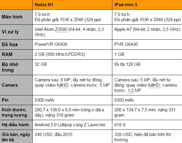 Bảng so sánh thông số cấu hình giữa Nokia N1 và iPad mini 3: