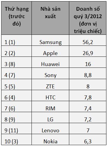 Dưới đây là danh sách 10 công ty bán được nhiều smartphone nhất trên toàn cầu, tính theo số lượng smartphone bán ra (nguồn Communities Dominate Brands).