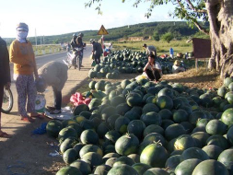 Cảnh tượng thật khác với vụ dưa hấu năm 2011, khi từng đoàn xe tải ra tận ruộng dưa của bà con nông dân xã Diên Bình, huyện Đăk Tô (Kon Tum) để thu mua dưa hấu. Nhiều tư thương thầu mua cả bãi dưa với giá 8.000 đồng/kg, nhưng năm nay không hề thấy mặt họ nữa.