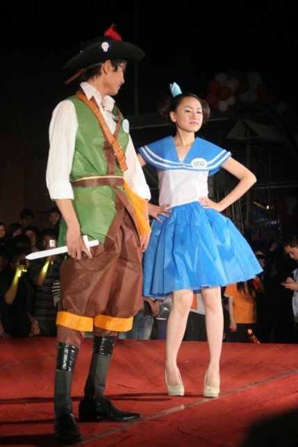 Chỉ từ những đồ bỏ đi như sách báo cũ, giấy nilon, vỏ lon nước ngọt, hay rau quả nhưng qua bàn tay sáng tạo độc đáo của các sinh viên ĐH Kinh doanh và Công nghệ đã trở thành những bộ trang phục độc đáo, lạ mắt nhưng vẫn thể hiện được đặc trưng của từng khoa ngành trong trường.