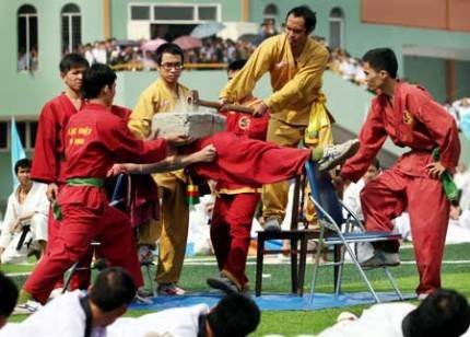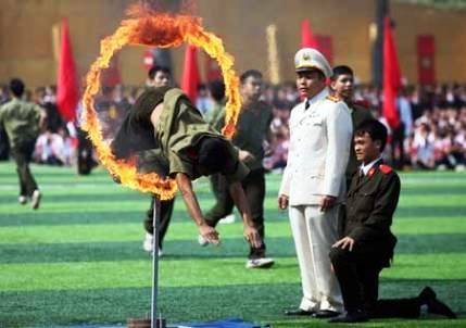 Trong Lễ kỷ niệm 65 năm Ngày truyền thống, sinh viên Học viện Anh ninh nhân dân có màn trình diễn dùng búa đập gạch đang đặt trên đầu.