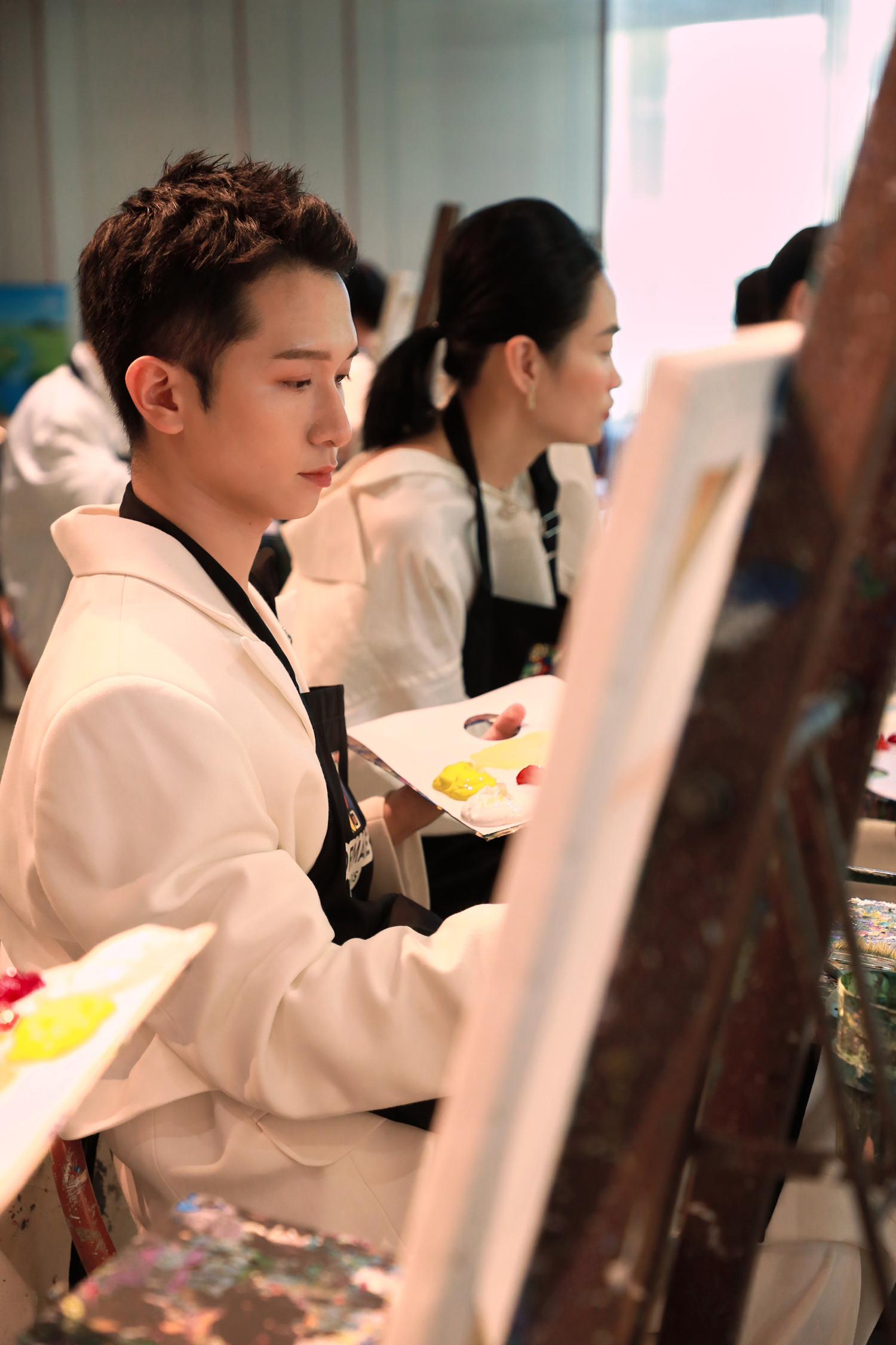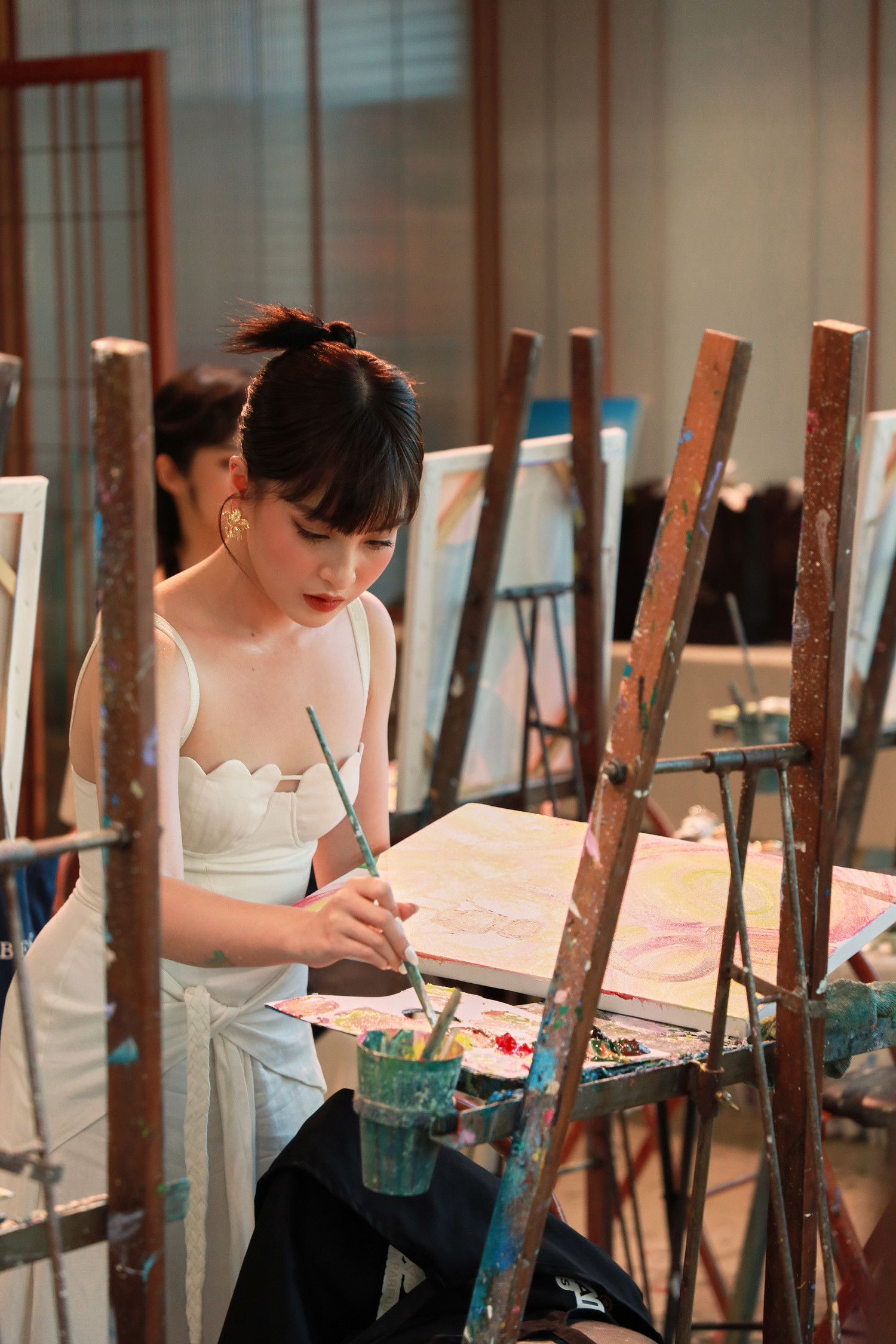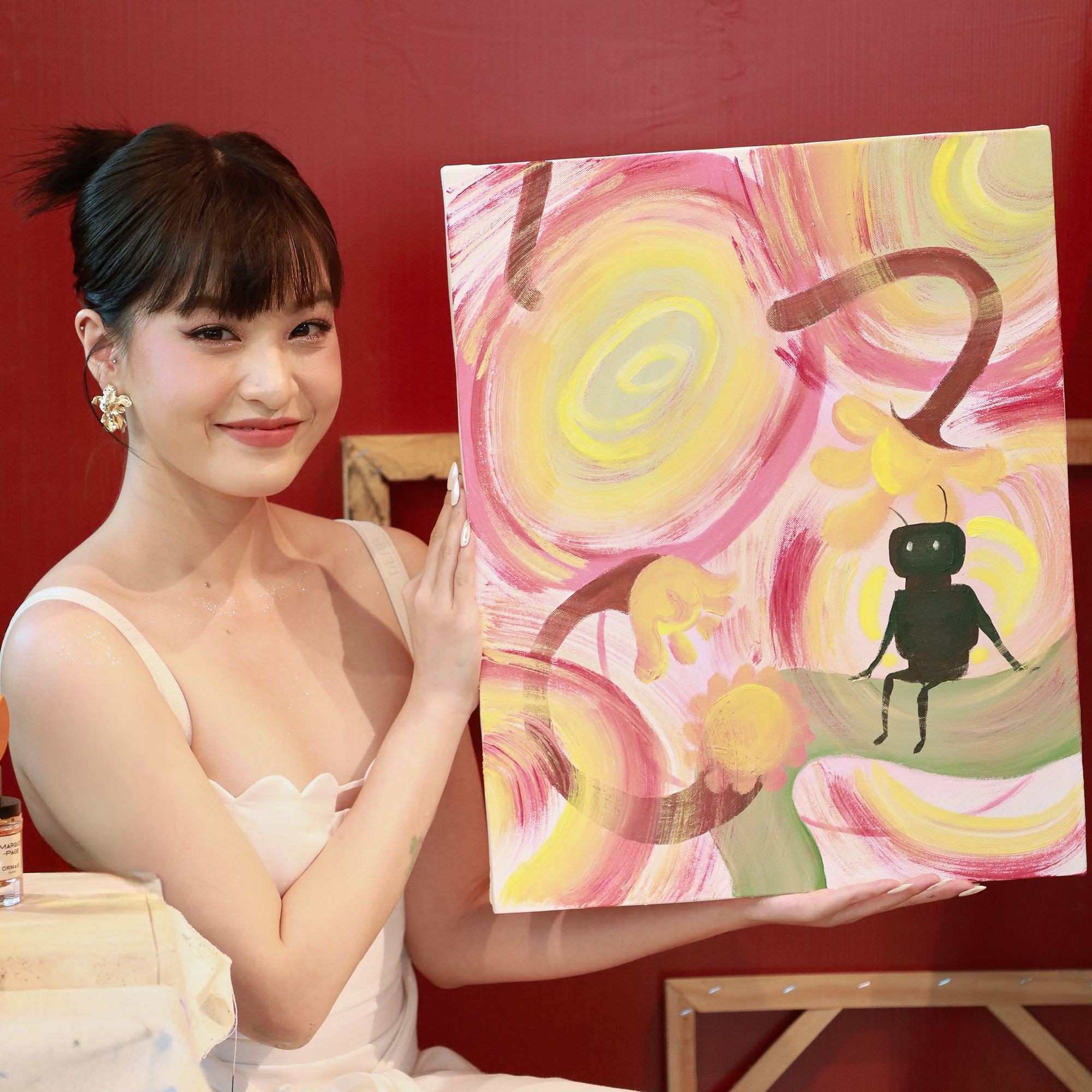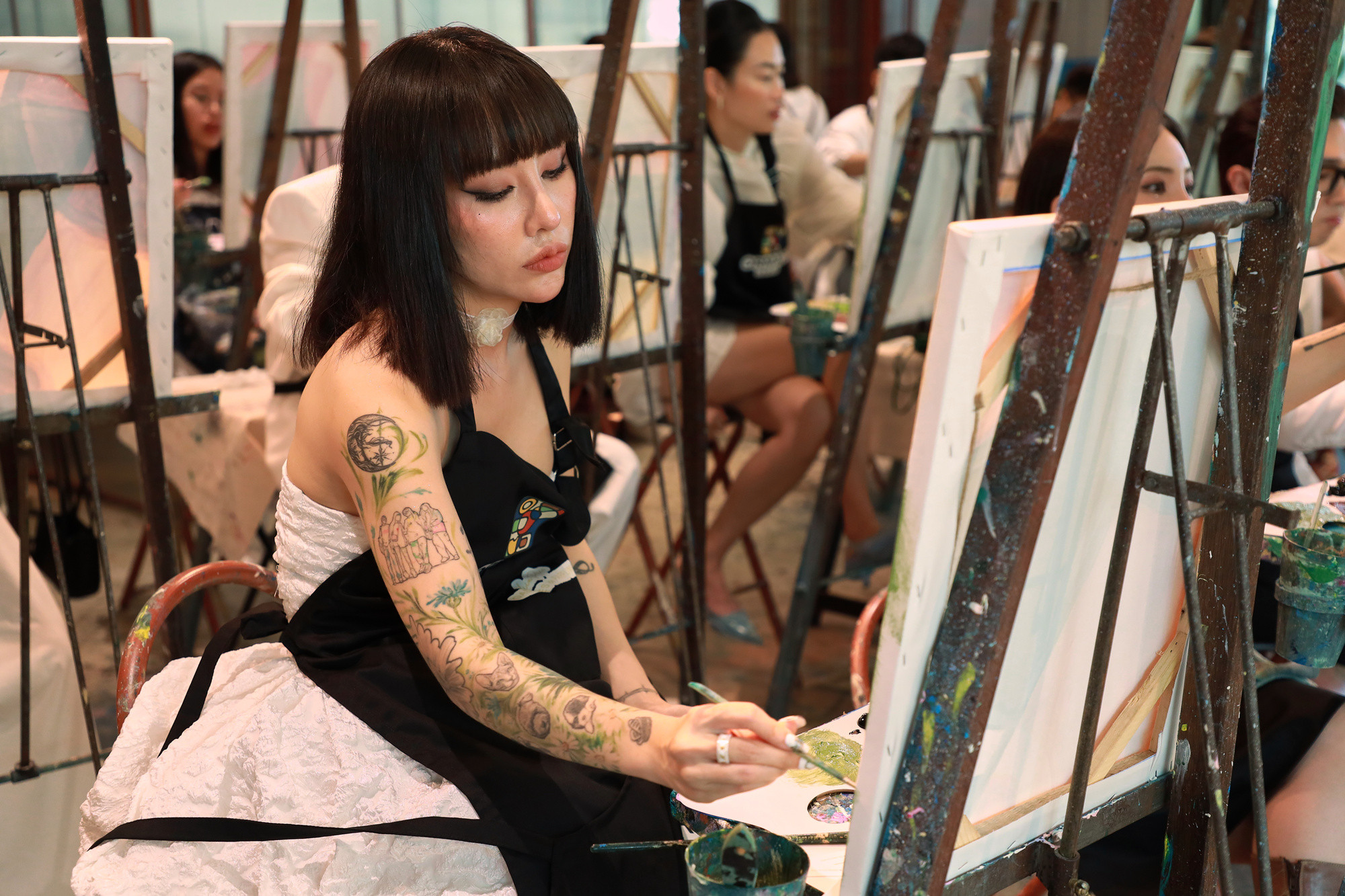 Các nghệ sĩ vừa có buổi vẽ tranh cùng nhau trong một buổi workshop tại TP.HCM. Họ được mời sáng tạo trong một lĩnh vực khác sở trường là hội họa.Diễn viên Thảo Tâm nói với VietNamNet thích vẽ từ nhỏ do mê truyện tranh, cô thường tập vẽ bằng bút chì các nhân vật hoạt hình mình yêu thích. Thảo Tâm được cha mẹ cho đi học vẽ bài bản nhưng không đi đến đâu vì cô "thiếu tính kiên nhẫn".Học cấp 1, Thảo Tâm tham gia một lớp vẽ màu sáp dầu, lên cấp 2 học một khóa vẽ màu acrylic nhưng cuối cùng không theo đuổi hội họa chuyên nghiệp. "Dù vậy tôi vẫn rất thích vẽ, đi học cứ rảnh tay và có giấy trống là vẽ", cô kể.Trong buổi workshop, Thảo Tâm lần đầu vẽ màu acrylic sau khoảng 3 - 4 năm. Cô cảm thấy nôn nao, nhiệt huyết. Trước câu hỏi của VietNamNet về ý nghĩa tác phẩm, diễn viên cho biết đó là sự kết hợp của các yếu tố: gỗ, nước hoa, mùa hè và nước Pháp. Hoa hậu các dân tộc Việt Nam 2022 Nông Thúy Hằng vẽ phong cảnh thiên nhiên lấy cảm hứng từ quê hương Hà Giang.Tham gia sự kiện, ca sĩ Du Uyên tự nhận "là cô gái yêu cái đẹp, nghệ thuật".MC Minh Xù chia sẻ: "Tôi thấy được kích thích sáng tạo khi vẽ trong không gian có tiếng piano du dương và hương thơm thoang thoảng. Những bản nhạc quen thuộc khiến tôi không thể ngừng hát theo nền nhạc ấy".Ca sĩ Annie nhóm LipB.Ca sĩ Đỗ Hoàng Dương.Nhà văn Anh Khang.Người mẫu Hà Kino.
