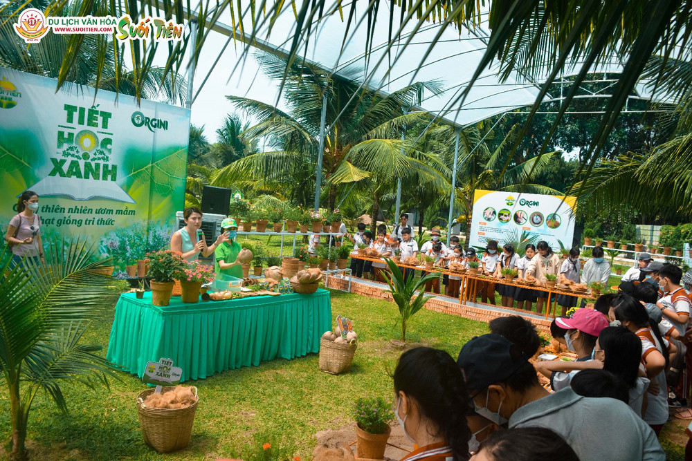 Ngoài ra, các em nhỏ còn có cơ hội tham gia “Tiết học xanh” để cùng nhau tìm hiểu về nguyên vật liệu có sẵn trong tự nhiên. Ví dụ như các bộ phận từ cây dừa có rất nhiều công dụng hữu ích: thân cây có thể tạo ra các sản phẩm nội thất trong nhà, lá dừa có thể dùng để lợp nhà, gói bánh, trái dừa cho nước uống và có thể chế biến thành các món ăn, đặc biệt là sợi xơ dừa để làm ra các sản phẩm tiêu dùng (khay đựng trái cây, chậu hoa, củ quả, vật dụng, đồ chơi…) rất gần gũi và thân thiện với môi trường, viên nén từ xơ dừa còn được dùng làm dinh dưỡng cho đất giúp cây phát triển tốt hơn.
