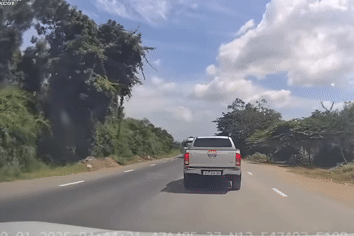 Nguy hiểm hơn, vào thời điểm này, có một ô tô bán tải cũng từ phía sau đi tới. Tuy nhiên, may mắn là người điều khiển chiếc xe này đã kịp thời đánh lái sang trái để tránh đâm vào người đi xe máy vừa ngã ra đường.