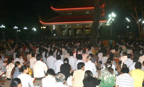 | Hàng ngàn người ngồi nghe thuyết pháp trên sân trước chánh điện |