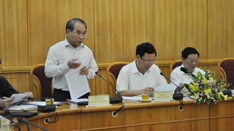 | Thứ trưởng Nguyễn Vinh Hiển (đứng) phát biểu trong buổi họp giữa UBND TP Hà Nội, lãnh đạo Bộ GD-ĐT, ngành giáo dục Hà Nội vừa diễn ra chiều 12/4. |