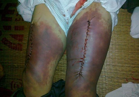 Những vết bầm tím lớn trên chân ông Thuận (Ảnh gia đình chụp lại)