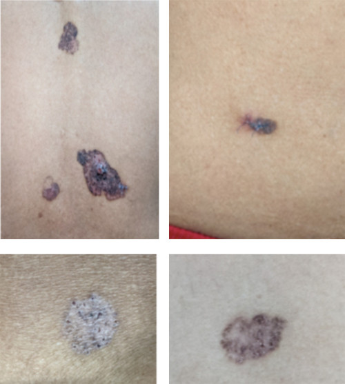 Tiến hành thăm khám da, bác sĩ phát hiện tuýp da Fitzpatrick IV và các dát tăng sắc tố không đều, bờ hơi nổi cao, có chút vảy mỏng, kích thước thay đổi. Với 7 vùng tổn thương tại lưng, bụng, đùi, bác sĩ kết luận bà bị đa ung thư biểu mô tế bào đáy chưa rõ nguyên nhân.