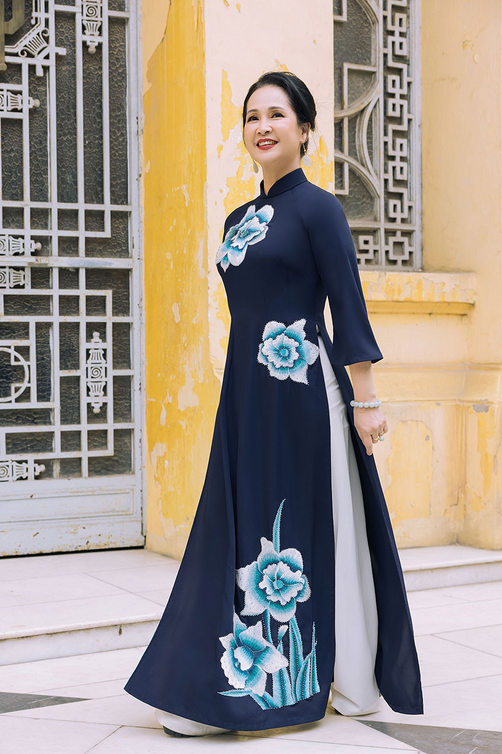 Sự tinh tế của trang phục còn ở những chi tiết đắp, kết cườm được thể hiện rõ nét, nổi bật như những giọt sương mong manh trên chất liệu nhung the. Phom áo truyền thống ôm sát khoe đường cong cơ thể.