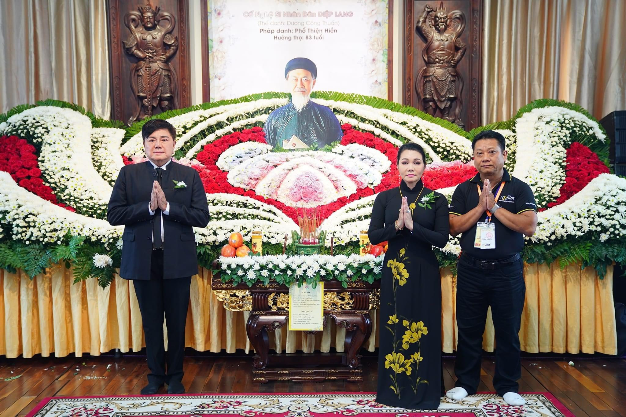 Lễ tưởng niệm và cầu siêu cho cố NSND Diệp Lang diễn ra từ 9h – 22h ngày 17/3 tại chùa Tường Nguyên (quận 4, TP.HCM). NSƯT Châu Thanh, Ngọc Huyền và đạo diễn Xuân Phước túc trực lo chu toàn lễ. NSƯT Ngọc Huyền cảm thấy mất mát khi người cha, người chú mình tôn kính ra đi vĩnh viễn. Cô nén đau thương để cố gắng làm tròn nghĩa vụ của mình. NSƯT Châu Thanh bật khóc trong giây phút tụng kinh cầu siêu cho cố nghệ sĩ. "Sinh Châu Thanh ra là cha mẹ, nhưng người thay đổi cuộc đời tôi là thầy Diệp Lang", anh nghẹn ngào nói. NSƯT Lê Tứ lớn lên với các vở tuồng cải lương của Diệp Lang. Sau này có cơ duyên theo nghề hát, anh tiếp tục được cố nghệ sĩ nâng đỡ, dìu dắt. Chị em NSND Thoại Miêu, Thoại Mỹ thắp hương tiễn biệt Diệp Lang. Vốn theo các vai đào tính cách, họ được ông truyền kinh nghiệm diễn xuất để chinh phục khán giả. NSND Ngọc Giàu bật khóc nức nở khi nhớ về những kỷ niệm với đàn anh quá cố. Cả hai từng gắn bó quãng thời gian dài, thấu rõ những vinh quang lẫn đoạn trường của nghiệp cầm ca. Ngọc Giàu nhớ mãi hình ảnh cuối cùng Diệp Lang trước khi ông từ biệt để sang Mỹ định cư. Bà mong được hội ngộ song cố nghệ sĩ tuổi cao sức yếu nên ước nguyện mãi không thành. NSND Lệ Thủy đau buồn khi chỉ vỏn vẹn 10 ngày đã phải nói lời tiễn biệt 2 người đồng nghiệp mình yêu quý là NSND Diệp Lang và NSƯT Vũ Linh. NSND Lệ Thủy hát 'Nửa đời hương phấn' tiễn đưa đàn anh. Bà nhiều lần nấc nghẹn, hát lạc giọng vì không kìm nén được cảm xúc.