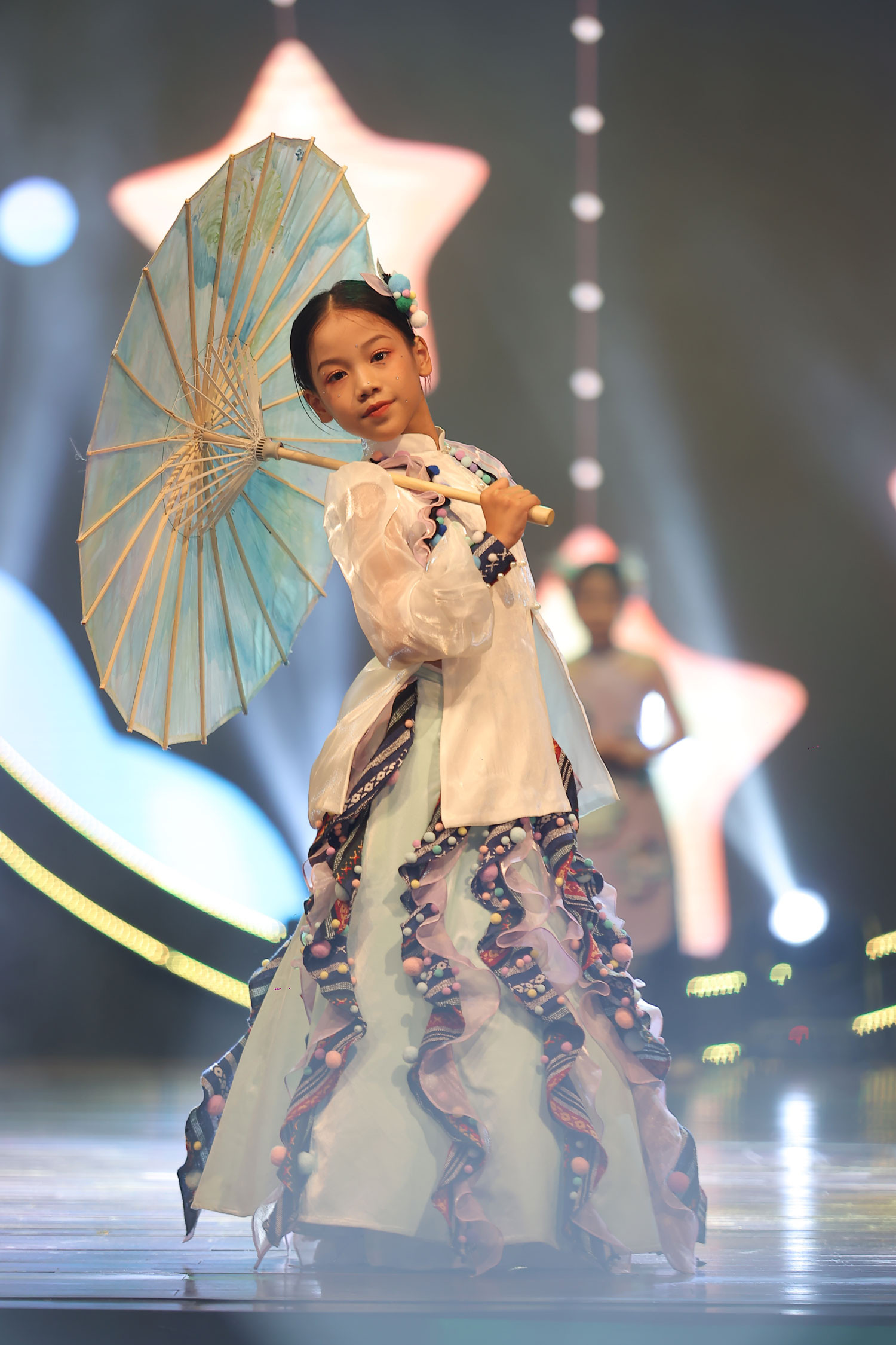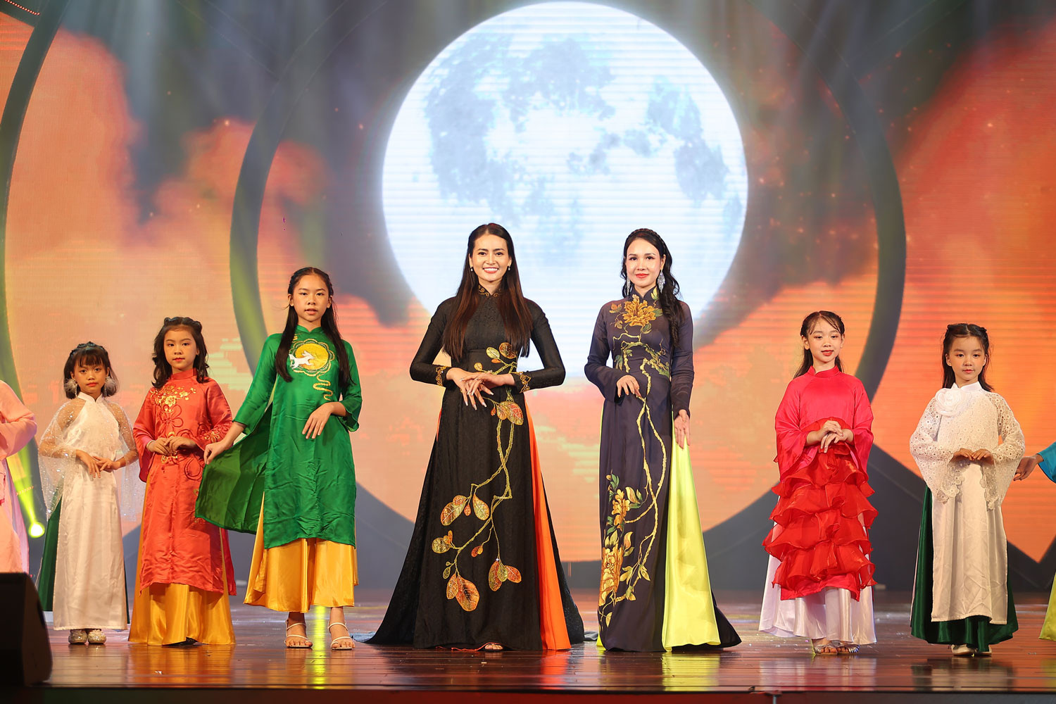 Phần trình diễn thời trang áo dài chủ đề Trẩy hội trăng rằm với những mẫu thiết kế lụa tơ tằm có các hình ảnh về Trung thu được vẽ thủ công khiến giới mộ điệu bất ngờ. Tham gia trình diễn là các người mẫu nhí cùng Nữ hoàng Yoga 2022 Nguyễn Thị Sơn và Á hậu Đỗ Anh Sa…
