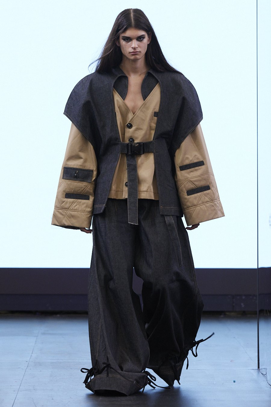 “Mọi người thường nghĩ vải denim là một cất liệu dày, cứng không thể chần bông nhưng tôi đã thử trải nghiệm nó. Trong số đó, có 1 sản phẩm rất đặc biệt là chiếc quần denim siêu rộng, to, dài 1m40, tôi có thể chui vừa một ống. Hầu hết tất cả sản phẩm thiết kế của tôi phải làm lại 2 lần, công đoạn chọn vải và thử nghiệm là khó khăn hơn cả. Tôi phải đi khắp chợ vải ở Hà Nội tìm kiếm chọn lọc hơn 20 mẫu vải nhưng chỉ có 5 mẫu vải phù hợp để hoàn thiện BST”, Đào Thu Trang cho biết.