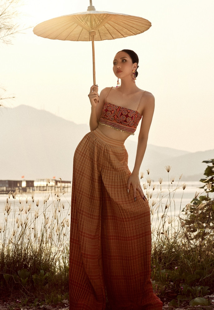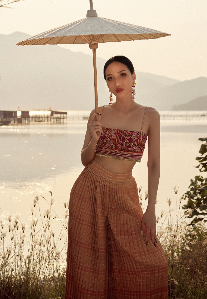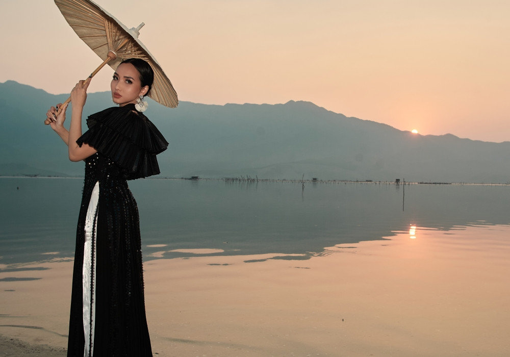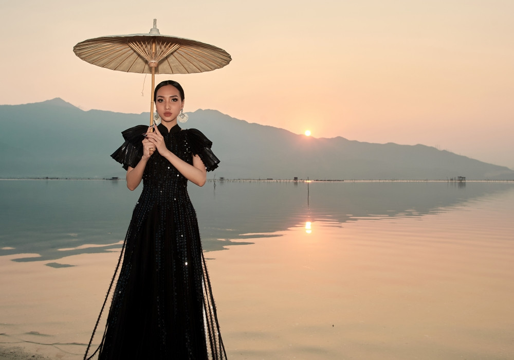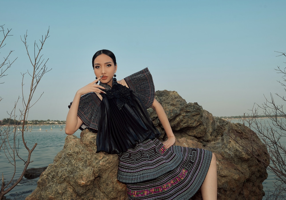 Hay bộ sưu tập Họa sắc y hương được lấy cảm hứng từ ký ức quê hương Huế. Đó là ráng chiều cùng nét bảng lảng bâng khuâng của Huế hay hình ảnh những công trình, kiến trúc cung đình nổi tiếng của vùng đất này.