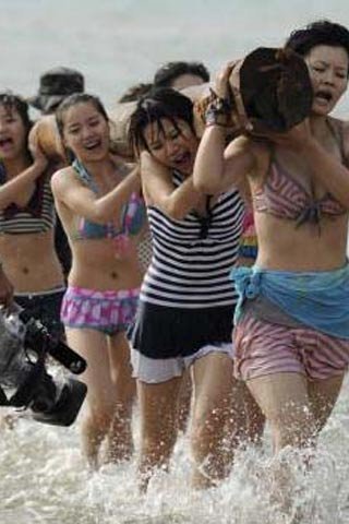 | Các cô gái mảnh mai đang phải vác một cây gỗ rất nặng |
