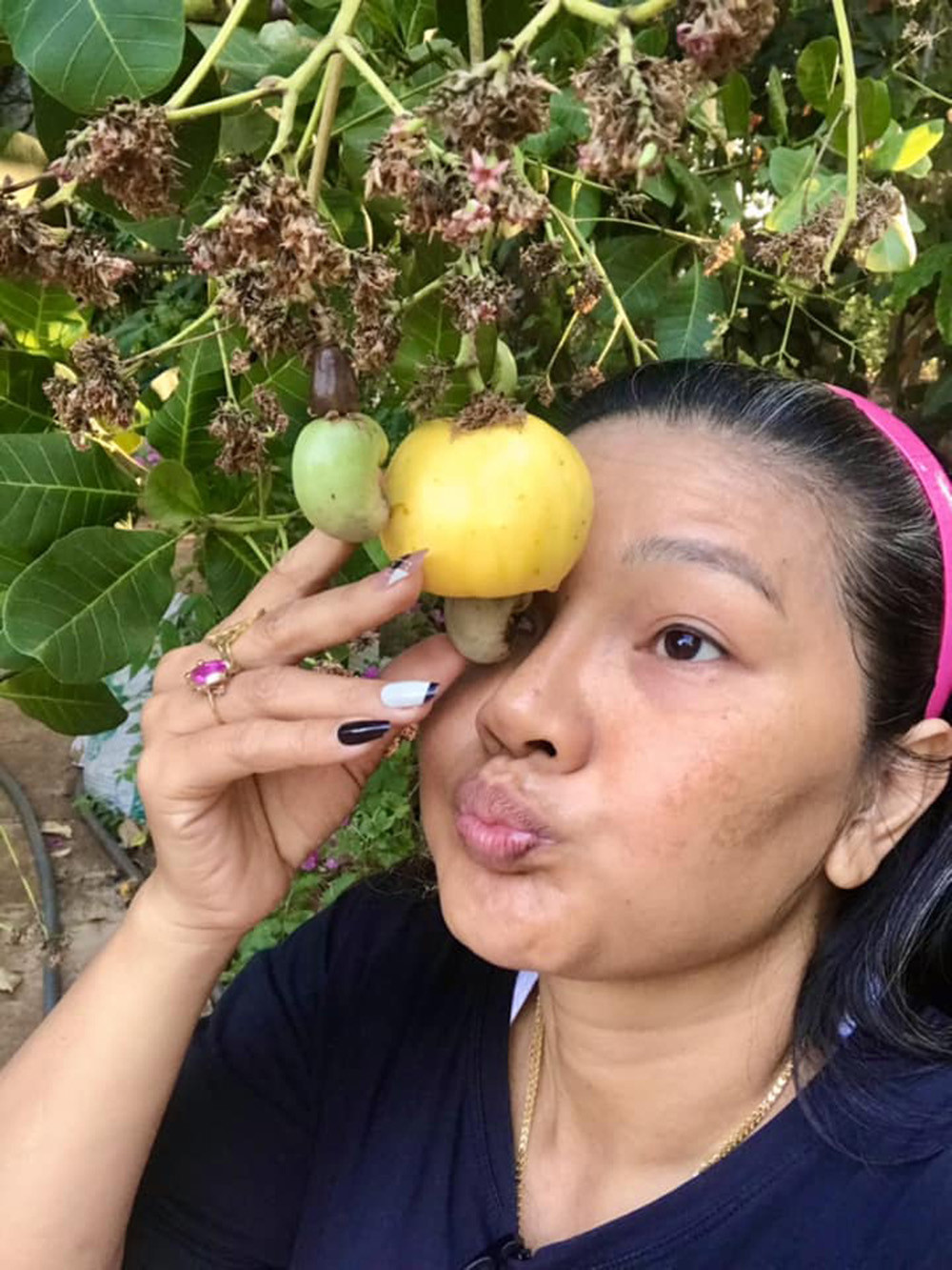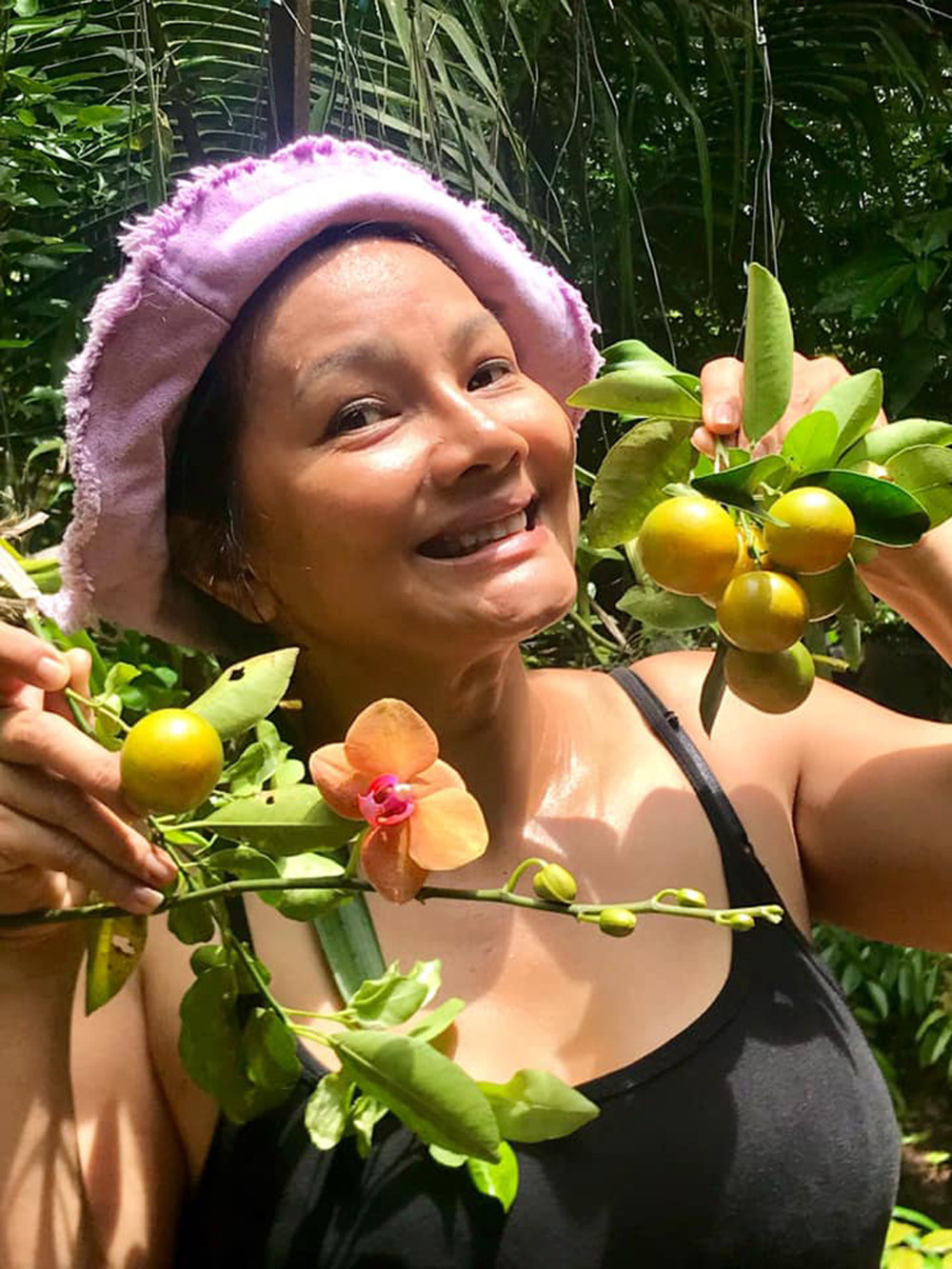 Hình ảnh đời thường trong vườn cho thấy niềm hạnh phúc của Kiều Trinh khi được sống giữa thiên nhiên. Mỗi lần về thành phố quay phim, chị lại nhớ nhung khu vườn và những trái cây chín mọng ở quê.