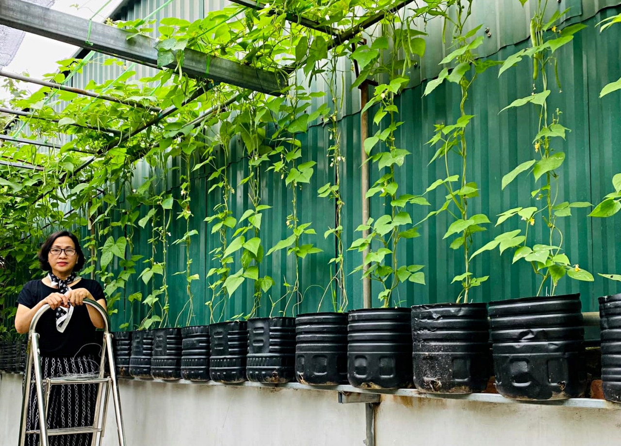 Bây giờ, dù vườn đã chật, tôi vẫn tận dụng mọi thứ. Ai cho rác gì tôi vẫn nhận. Hết chỗ trồng dưới mặt sân, tôi làm giá, kệ, giàn đặt, treo lên để trồng. Với cách này, khu vườn sẽ thu nạp thêm nhiều rác khiến rác không bị thải ra môi trường bên ngoài”.