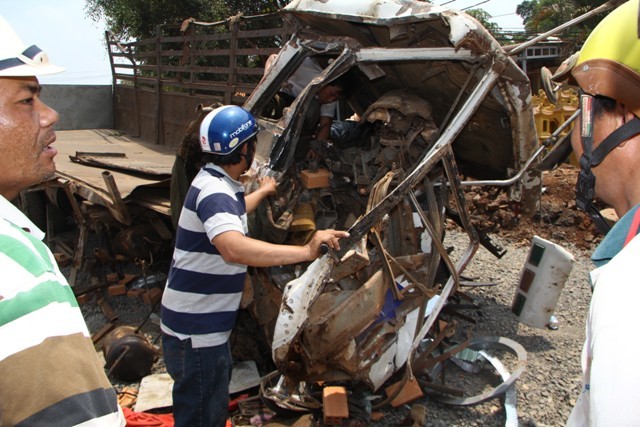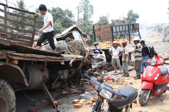 Cú tông mạnh khiến phần đầu 2 xe bẹp giúm, dính chặt vào nhau vỡ nát. Gạch và phế liệu trên các xe đổ tràn xuống đường. Các nạn nhân trên 2 xe bị kẹt cứng trong cabin. Vụ tai nạn khiến 6 nạn nhân chết ngay tại chỗ. Nạn nhân nữ duy nhất trên xe may mắn sống sót là Nguyễn Thị Kim Cúc cũng bị thương nặng.