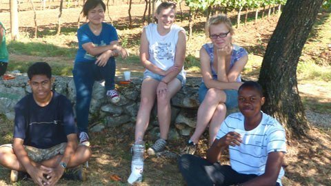 | Thảo (thứ 2 từ trái sang) cùng các bạn thu hoạch nho tại vườn rượu nho miền Bắc Ý. |