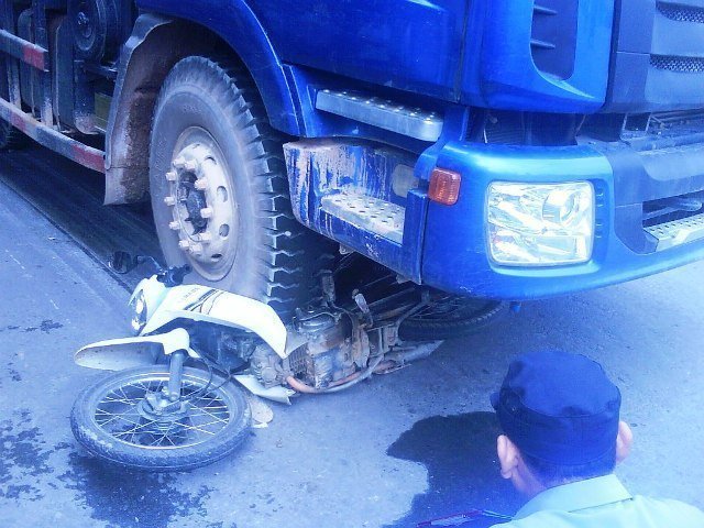 Tại hiện trường, chiếc xe máy Serius (chưa rõ BKS) bị nát vụn nằm dưới bánh xe tải. Rất nhiều người hiếu kì đã dừng lại chứng kiến vụ tai nạn thương tâm làm giao thông bị ùn tắc.