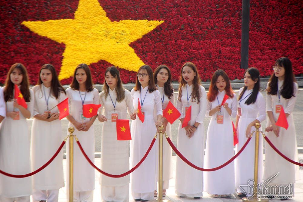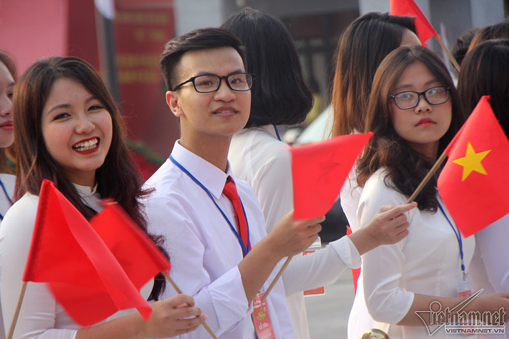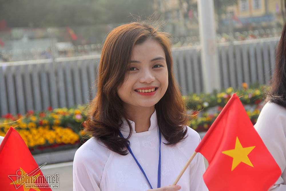 Các nữ sinh viên mặc áo dài trắng, tay cầm cờ cười rạng rỡ.