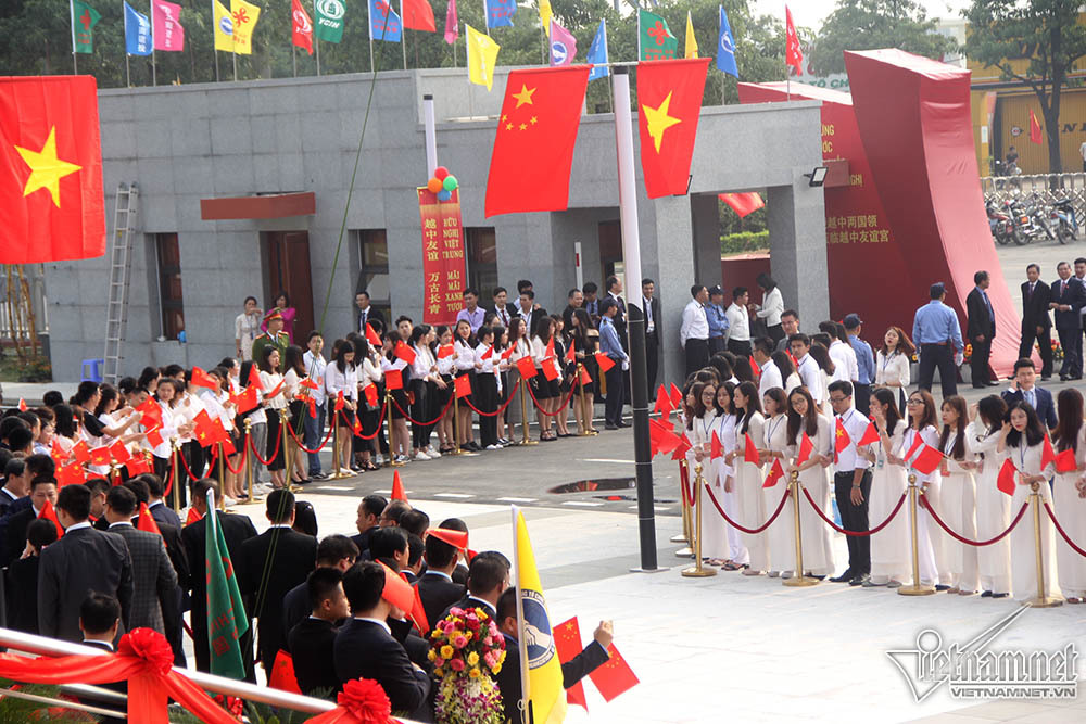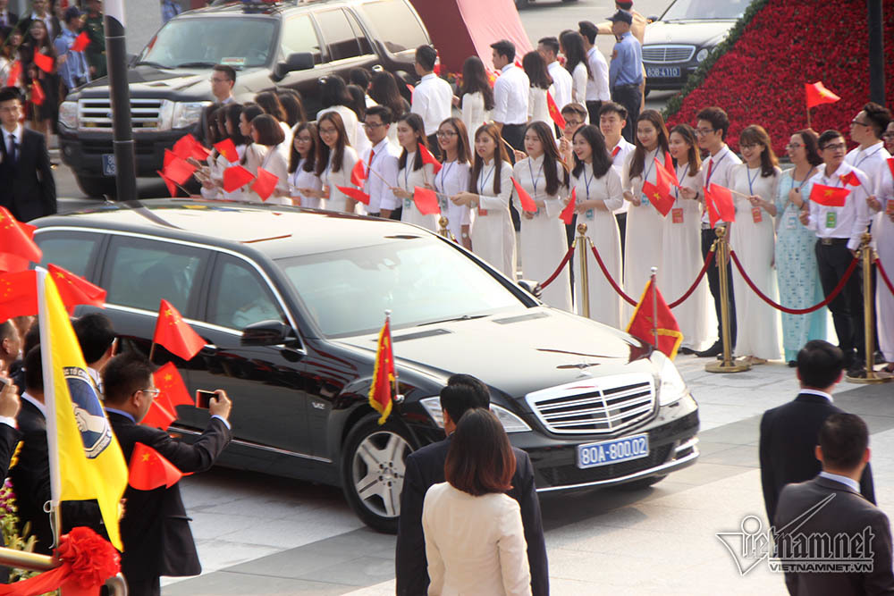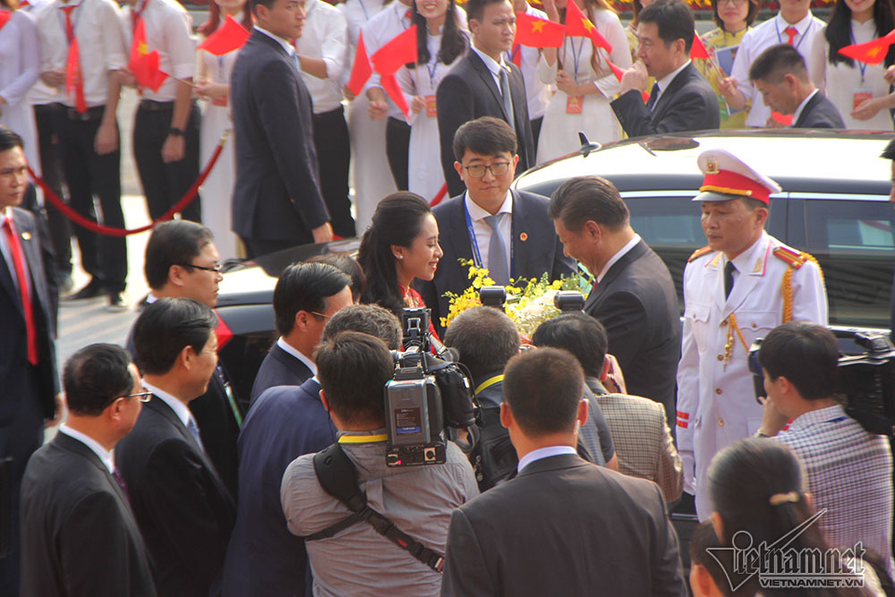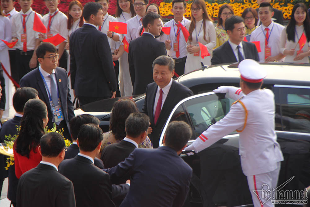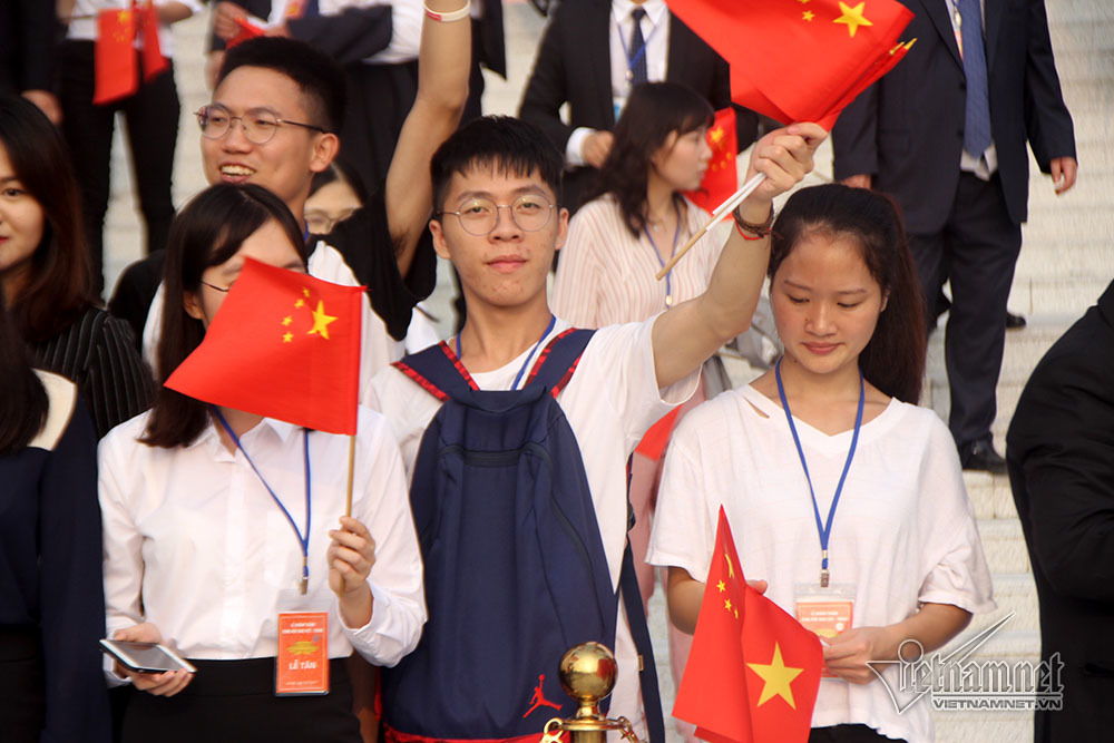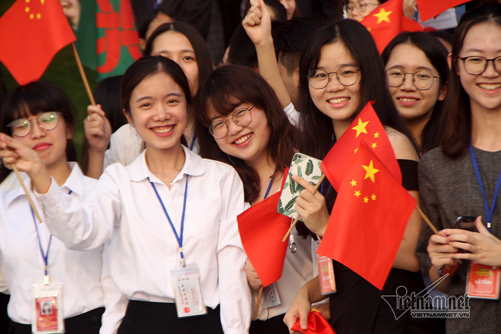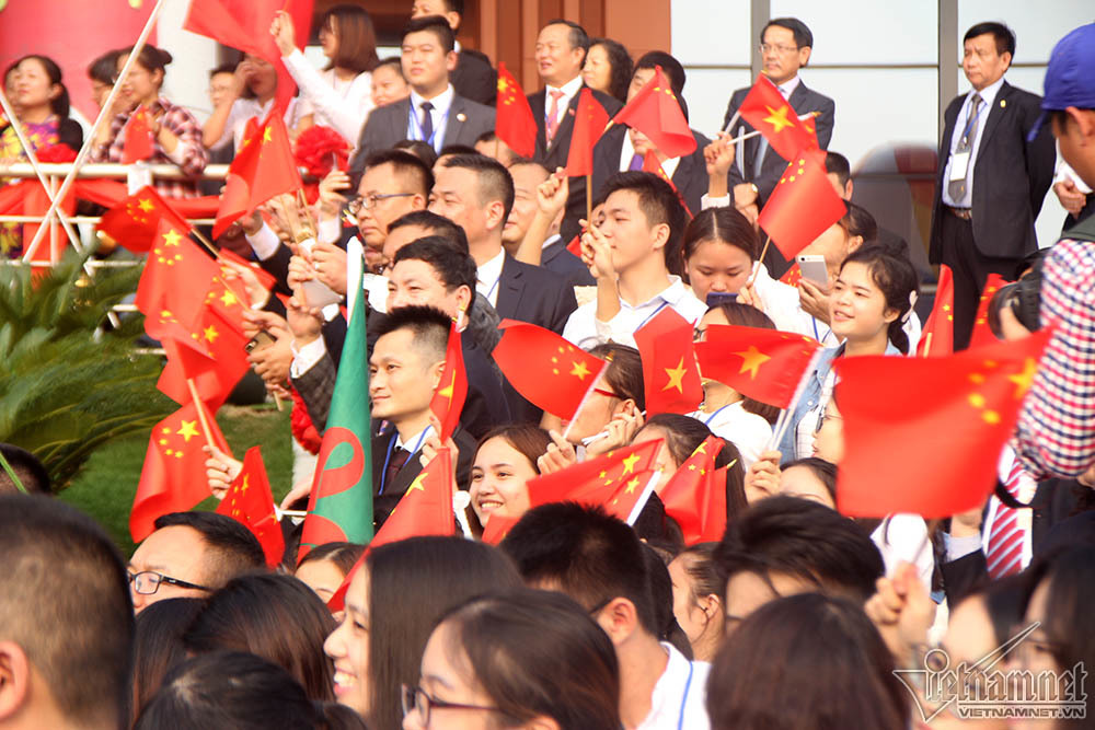 | Khi đoàn xe của Tổng bí thư, Chủ tịch Trung Quốc Tập Cận Bình tiến vào, sinh viên 2 nước đồng thanh hô chào mừng |